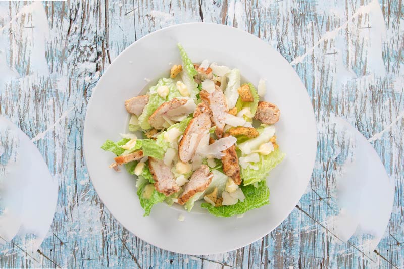 Alface iceberg, tomate cherry, croutons, bacon, frango grelhado, pinhões, parmesão, molho césar